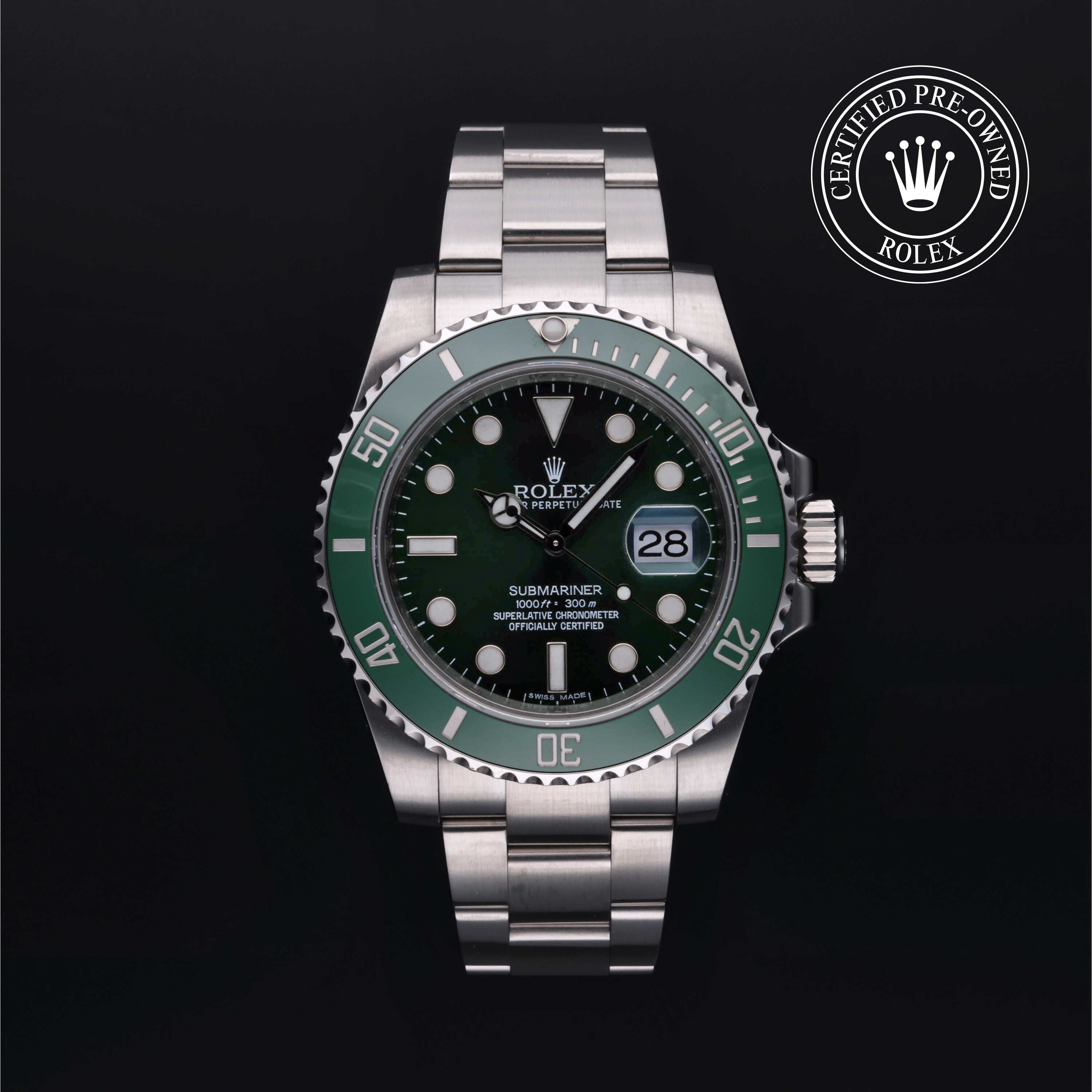 This Rolex Certified Pre-Owned Submariner is crafted from stainless steel and features a green dial and unidirectional rotating bezel in a 40 mm case.