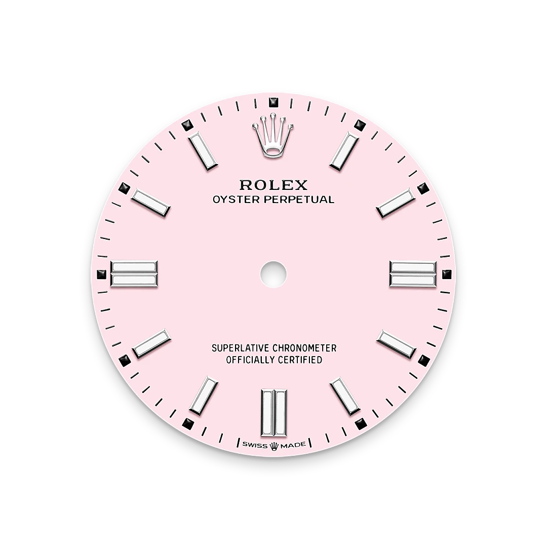 The colours created for the Oyster Perpetual range start life as a lacquer, which must be meticulously applied in a controlled-atmosphere environment to avoid dust and other contamination. The brass plate of the dial base receives layer upon layer of lacquer, six in all, to form a regular, uniform surface. The last step is varnishing and polishing to bring out the full brilliance and depth of colour. The various inscriptions are then pad printed, and the hour markers and crown riveted by hand. The dial, gleaming in its perfection, is all set to take its place on top of the movement at the watch assembly phase.