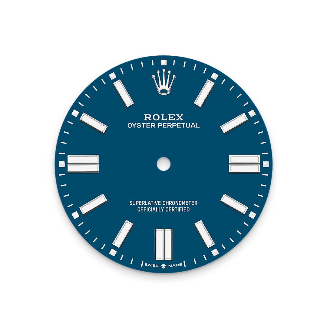 The colours created for the Oyster Perpetual range start life as a lacquer, which must be meticulously applied in a controlled-atmosphere environment to avoid dust and other contamination. The brass plate of the dial base receives layer upon layer of lacquer, six in all, to form a regular, uniform surface. The last step is varnishing and polishing to bring out the full brilliance and depth of colour. The various inscriptions are then pad printed, and the hour markers and crown riveted by hand. The dial, gleaming in its perfection, is all set to take its place on top of the movement at the watch assembly phase.