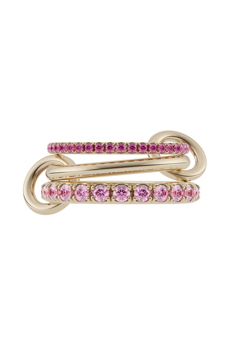 Norah Ring in 18k yellow gold, size US 7, three linked rings with yellow gold connectors, dark and light pink sapphires... total 1.9 ct. G VS
