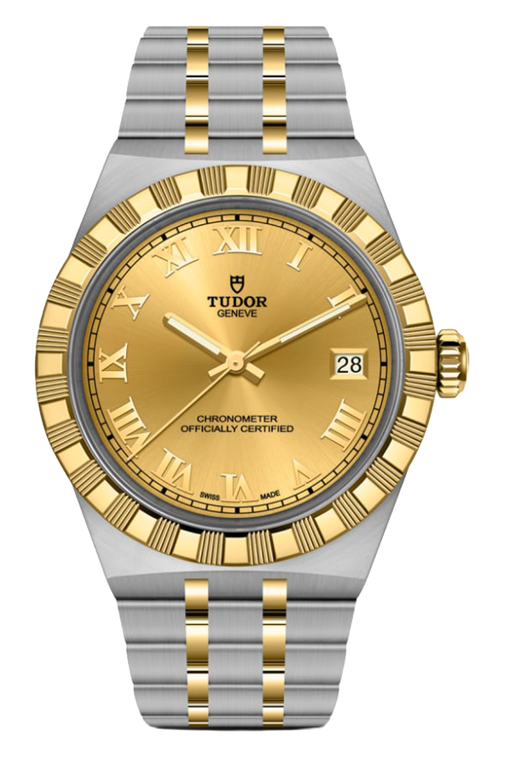 With its integrated metal bracelet ensuring an uninterrupted line with the case, this TUDOR Royal embodies fluidity... and unmistakable style. Characterised by its three wide satin-brushed links set between two slimmer polished elements, the smooth quality of its surfaces and edges, as well as the presence of the "T-fit" clasp, emphasise the importance that TUDOR places on ensuring its comfort on the wrist. Available in stainless steel or with alternating links in stainless steel and yellow gold, the meticulous finishes of the models in this range cater to every taste.