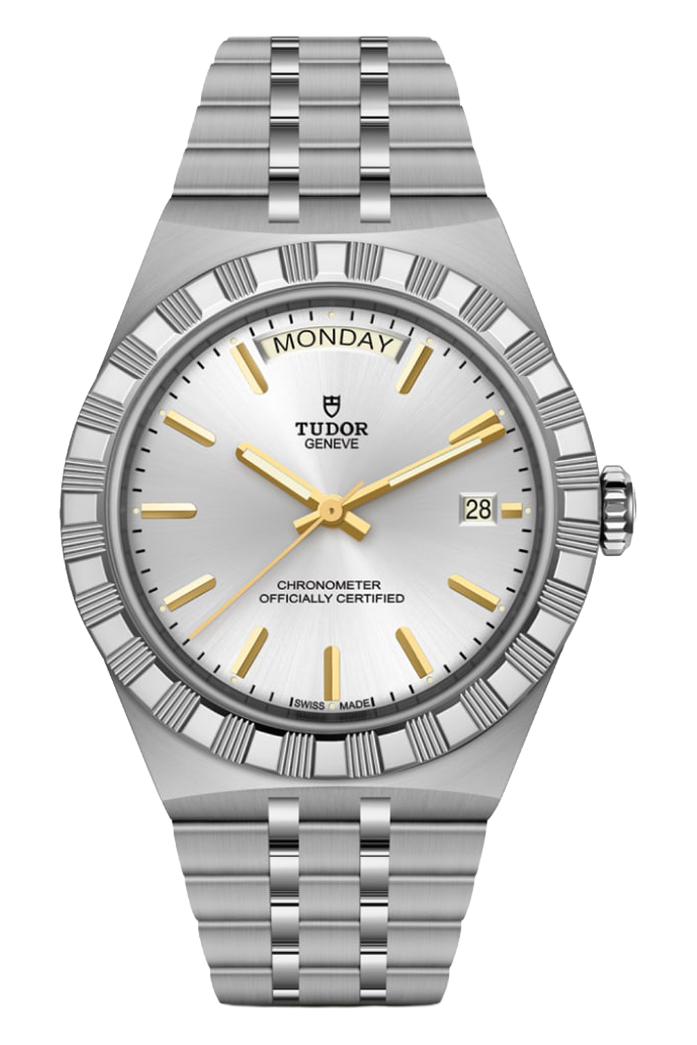With its integrated metal bracelet ensuring an uninterrupted line with the case, this TUDOR Royal embodies fluidity... and unmistakable style. Characterised by its three wide satin-brushed links set between two slimmer polished elements, the smooth quality of its surfaces and edges, as well as the presence of the "T-fit" clasp, emphasise the importance that TUDOR places on ensuring its comfort on the wrist. Available in stainless steel or with alternating links in stainless steel and yellow gold, the meticulous finishes of the models in this range cater to every taste.