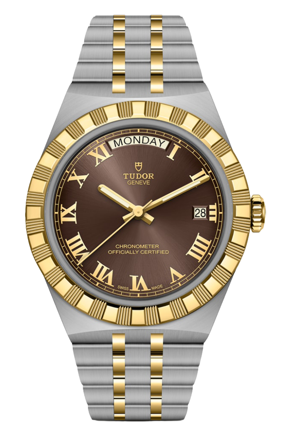 With its integrated metal bracelet ensuring an uninterrupted line with the case, this TUDOR Royal embodies fluidity... and unmistakable style. Characterised by its three wide satin-brushed links set between two slimmer polished elements, the smooth quality of its surfaces and edges, as well as the presence of the "T-fit" clasp, emphasise the importance that TUDOR places on ensuring its comfort on the wrist. Available in stainless steel or with alternating links in stainless steel and yellow gold, the meticulous finishes of the models in this range cater to every taste.