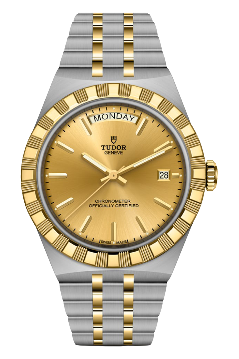 With its integrated metal bracelet ensuring an uninterrupted line with the case, this TUDOR Royal embodies fluidity... and unmistakable style. Characterised by its three wide satin-brushed links set between two slimmer polished elements, the smooth quality of its surfaces and edges, as well as the presence of the "T-fit" clasp, emphasise the importance that TUDOR places on ensuring its comfort on the wrist. Available in stainless steel or with alternating links in stainless steel and yellow gold, the meticulous finishes of the models in this range cater to every taste.